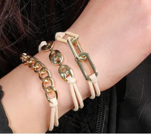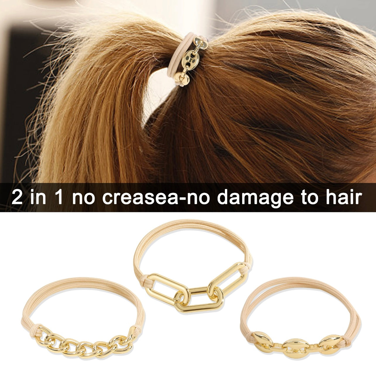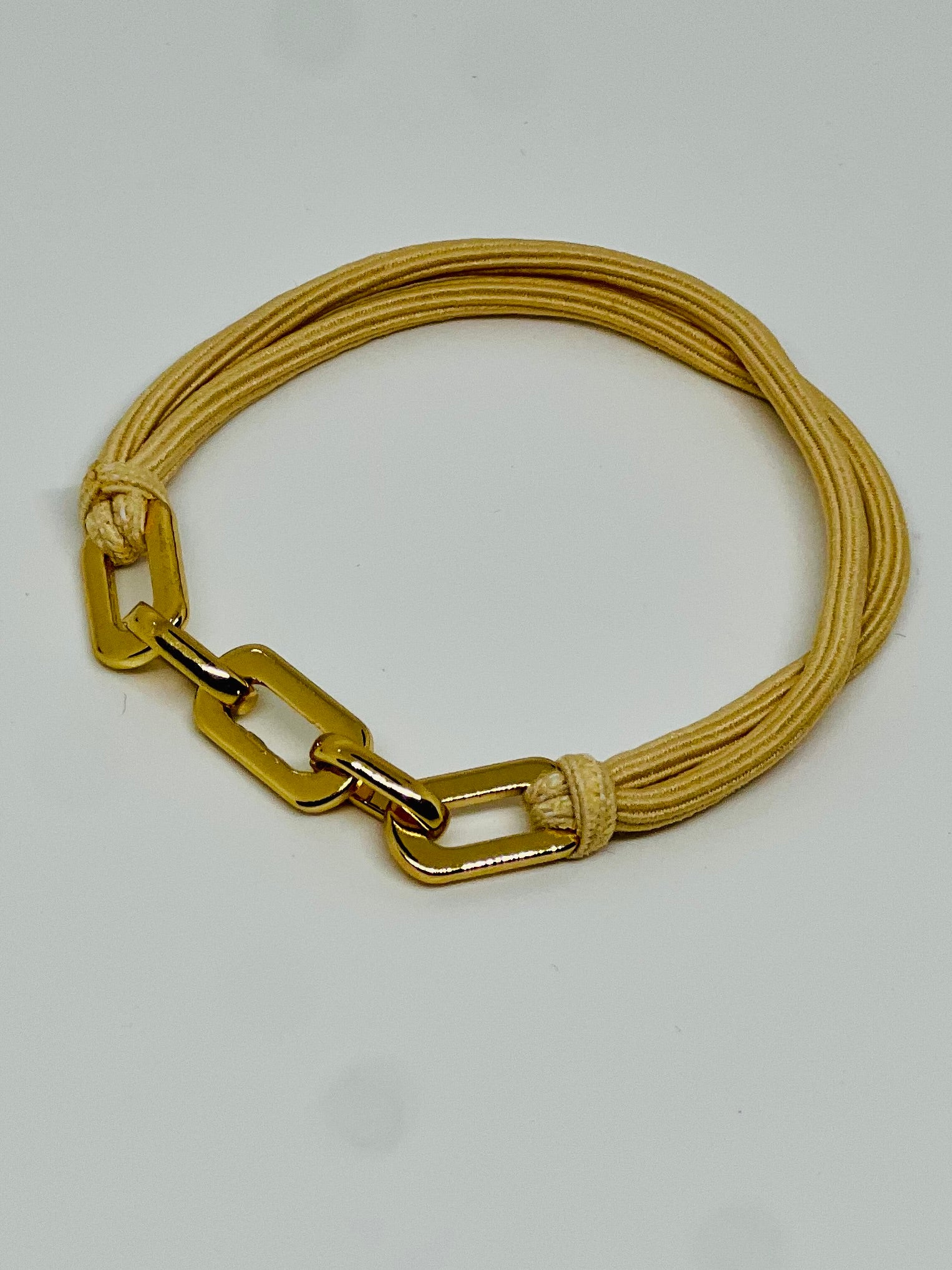 Adorned with gold link chain, these bracelets offer a touch of elegance that can complement any outfit. Whether you're pulling back your tresses for a workout or accenting your wrist for a night out, our Hair Tie Bracelets are the perfect combination of practicality and polish. Embrace effortless style with this must-have accessory in your jewelry drawer or hair care arsenal.